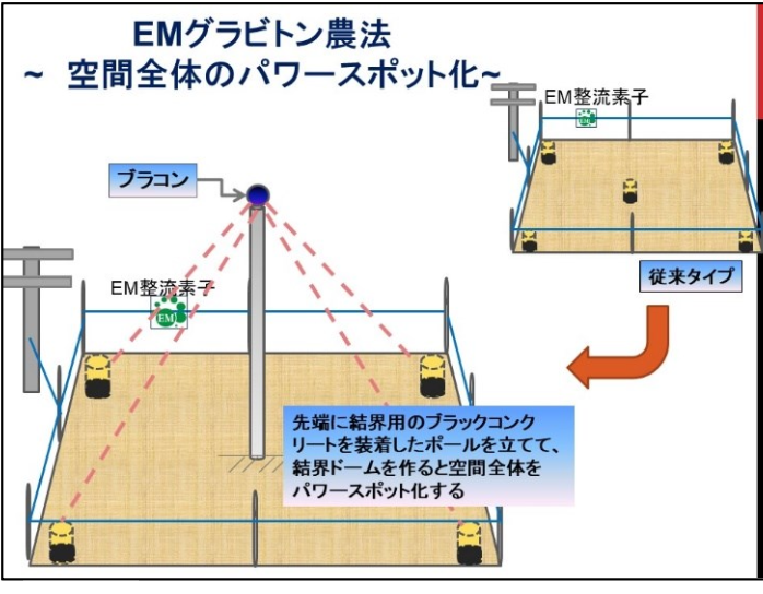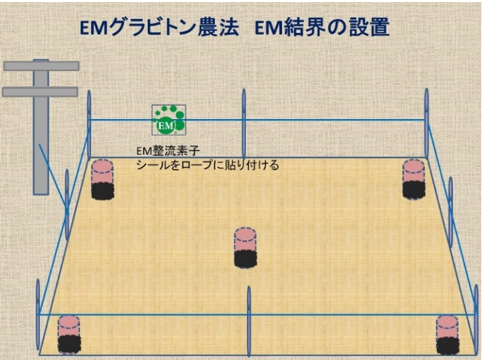 結界を強化するには、年に数回、結界部分に塩と EM グラビトロン炭を混和したものを 100g、EM 活性液 100ml、農地に EM 炭などを施用します。