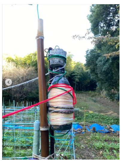 ただ今回の設置は時間的な都合もあり、圃場を囲む4辺ではなく3辺の設置となり、残りの1辺は整流結界に使用した紐のみを繋ぐ形となった。また波動源は獣害対策用の電柵本体を用い、昼夜電圧が掛かるように設定した。