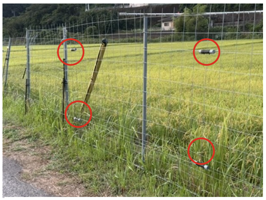 その後、塩ビパイプに毛糸を300~350回巻き付け、熱収縮チューブで毛糸が外れないように固定した。設置方法はスーパーコイルを田圃の獣害柵に約500個を設置。間隔は2.5m、高さは150㎝と40cmに設置した。